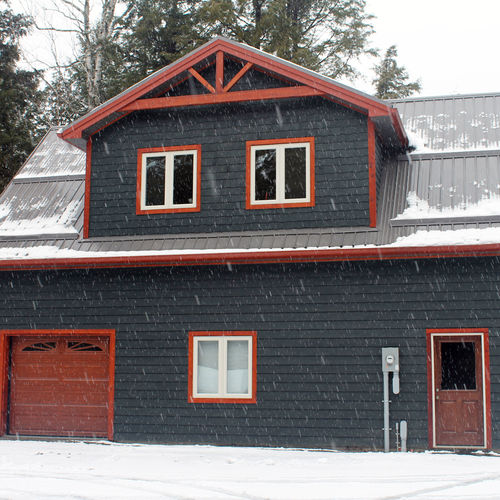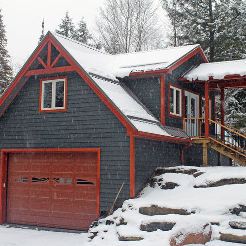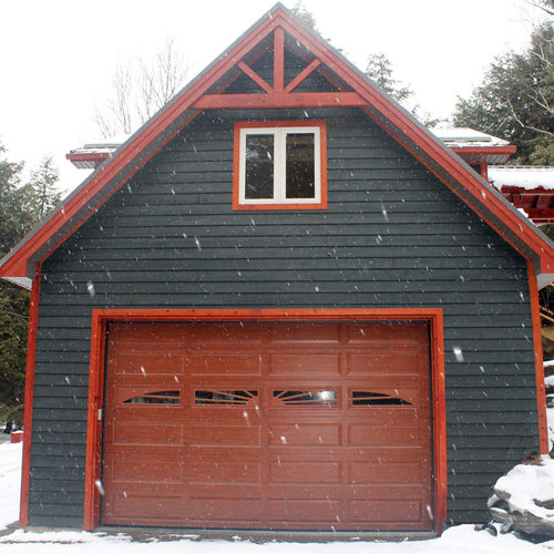 This large garage was the first phase of this project, eventually leading to building a new cottage. With a high post and beam covered porch entry, through the double doors guides you into the loft above the garage. Nestled into the side of the hill, this garage has space for all of your needs.
