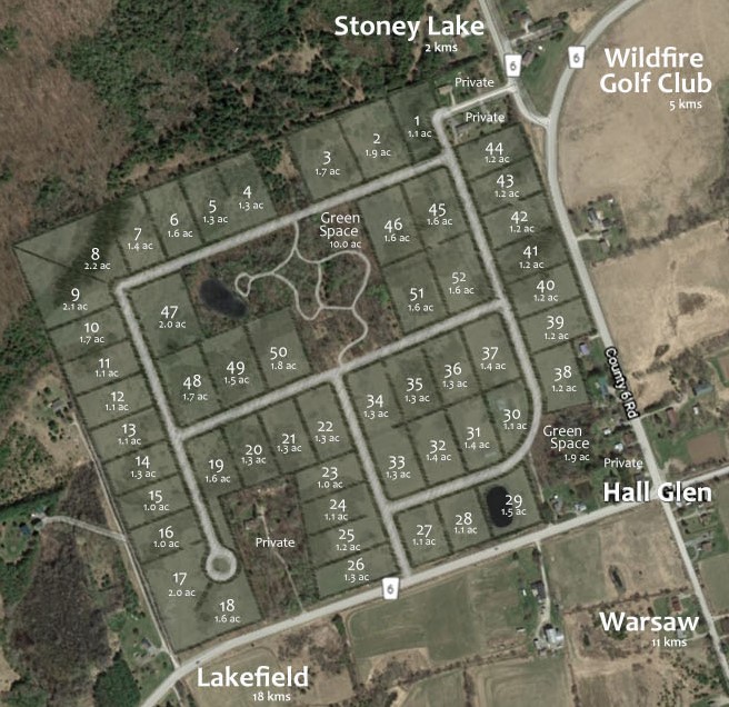 The estate lots are located in a private natural setting surrounded by golf courses (recently selected for PGA Tour Canada at Wildfire), restaurants, provincial parks and many villages and towns surrounding the area. Lakefield is just a 15 minutes drive away while the City of Peterborough is just 25 minutes for anything you need. Boating, skiing, ATV and Snowmobile trails are all near by as are unlimited lakes for fishing and swimming.